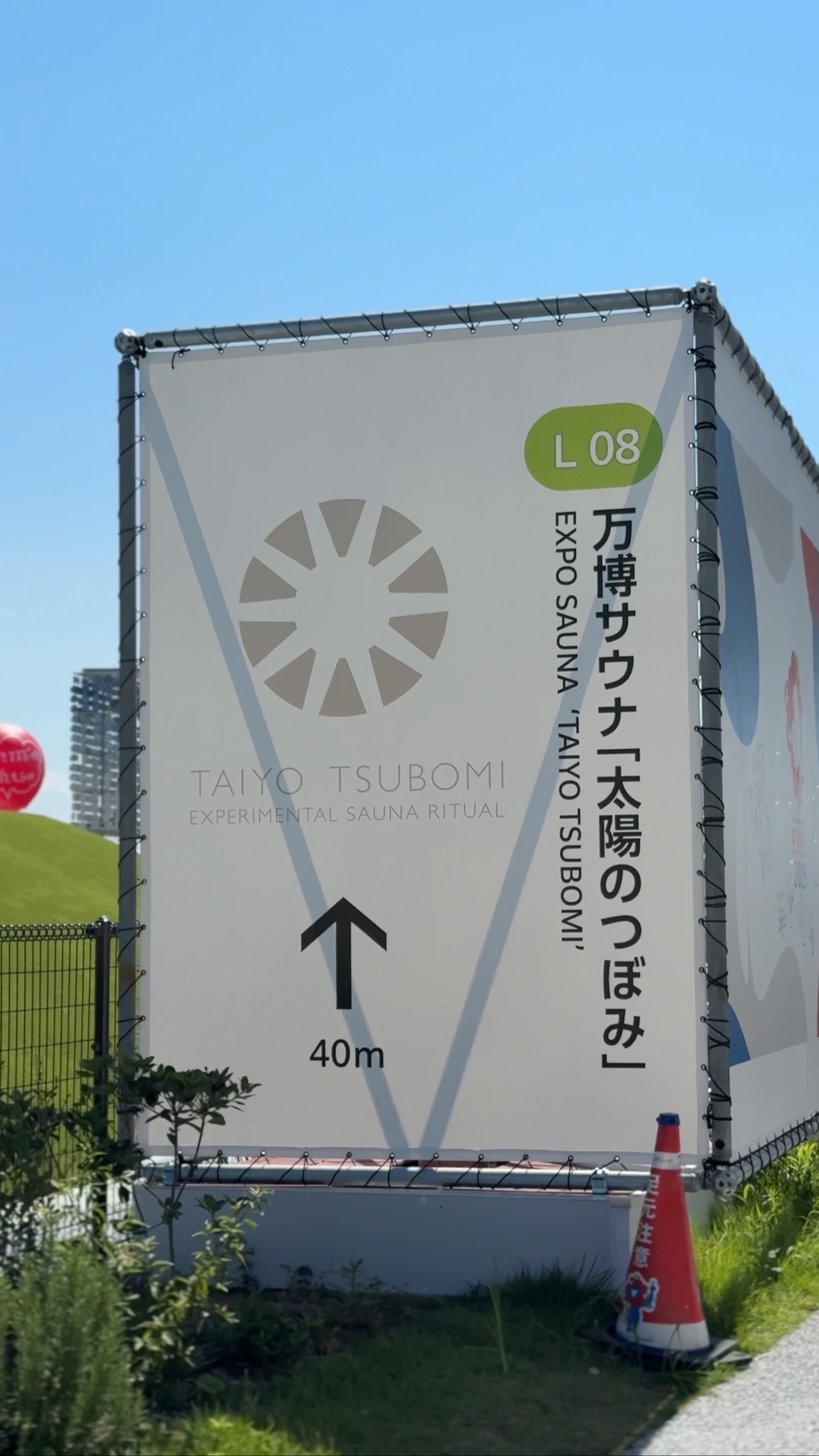 万博会場の西の端に位置するサウナエリアに辿り着くまでにすでに汗だくで、奥へ奥へと向かうと、突き当たった先には太陽の光を集めるように柔らかい曲線が天へと伸びる。